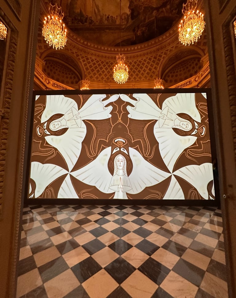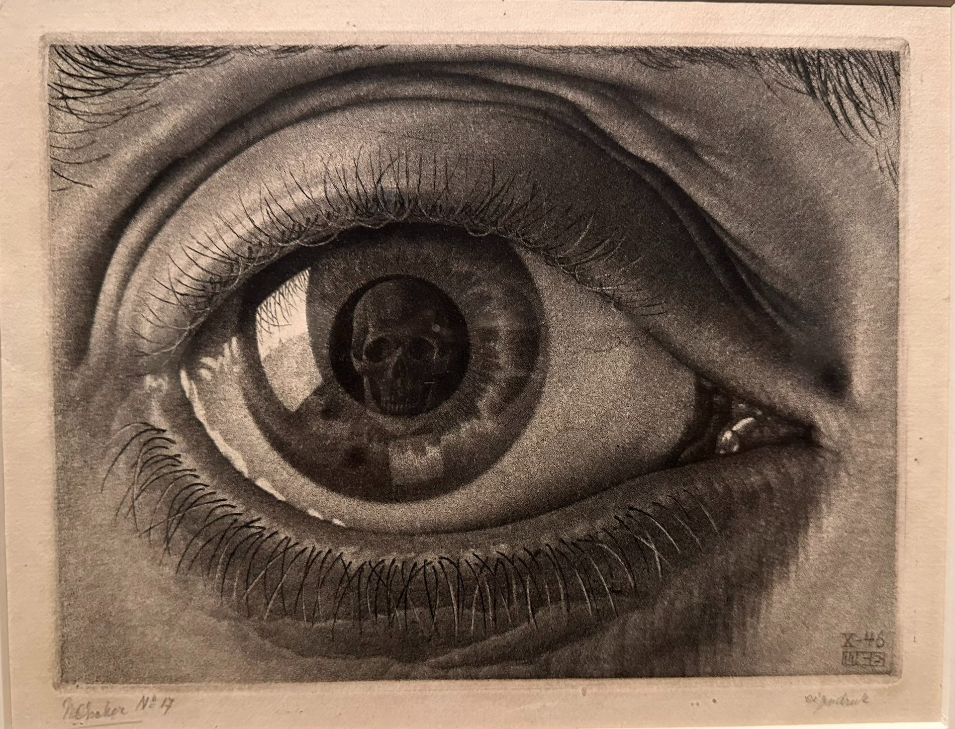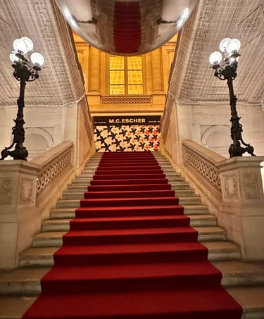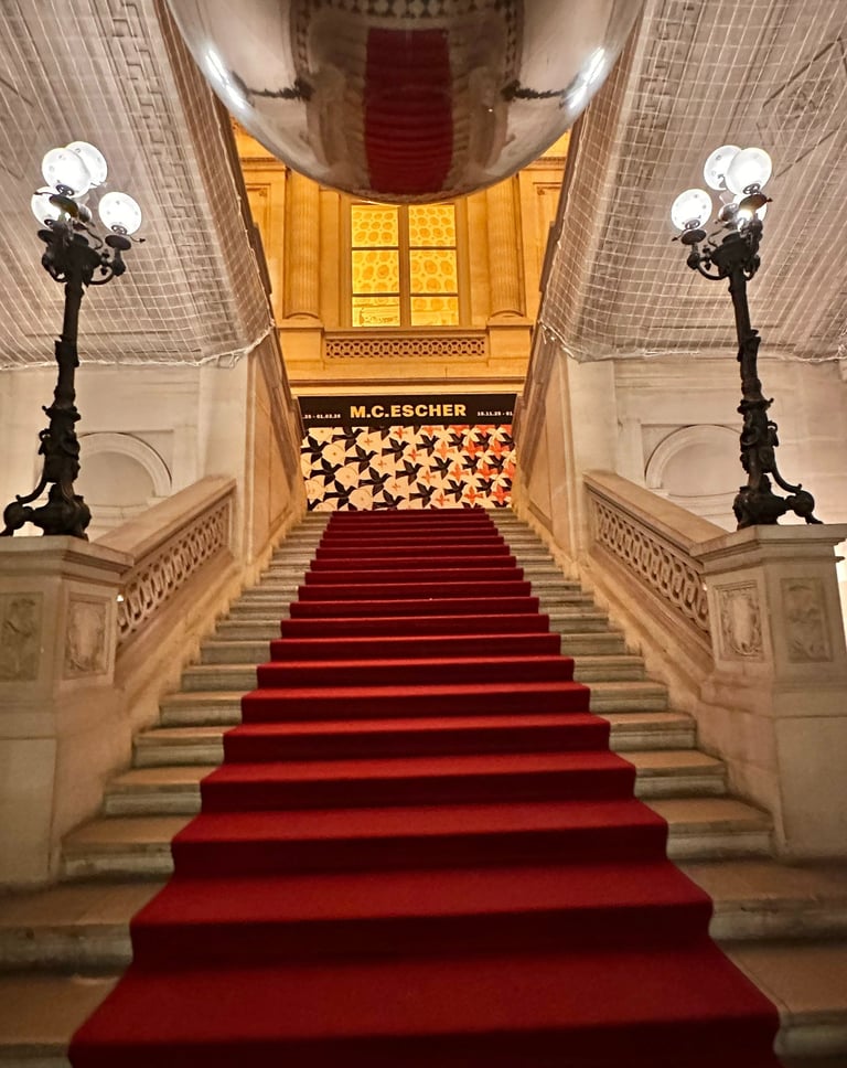 The exhibition at the Museum Monaie de Paris is divided into eight main sections that trace M.C. Escher's artistic career. The exhibition begins with realistic prints and drawings inspired by nature and Italian landscape, the macabre, spiritualism, forced perspectives, and ambigous images. A unique journey to explore a range of prints that capture his unique ability to blend reality with illusion, turning seemingly simple landscapes into complex visual puzzles.