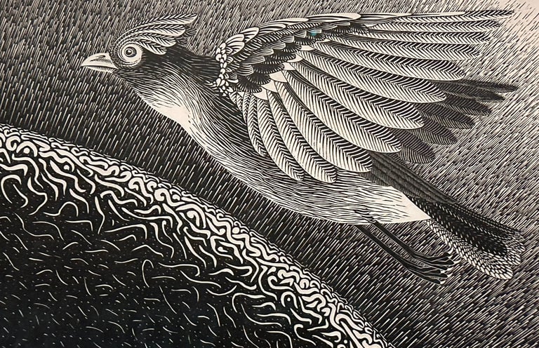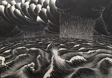 The collection titled The Days of Creation, which adheres to the biblical storyline, comprises six woodcuts created between December 1925 and March 1926. These pieces illustrate the initial six days of Creation, concentrating on the final results rather than the Creator himself. A few months after finishing this collection, in 1926, Escher crafted a kind of frontpiece showcasing a bird, the Italian titles of the prints, along with the related biblical excerpts. This series was finalized in 1927 with The Fall of Man. The Second Day of Creation (The Division of the Waters) is regarded as one of Escher's earliest masterpieces and drew inspiration from the woodcut The Great Wave of Kanagawa by the Japanese artist Katsushika Hokusai (1830)