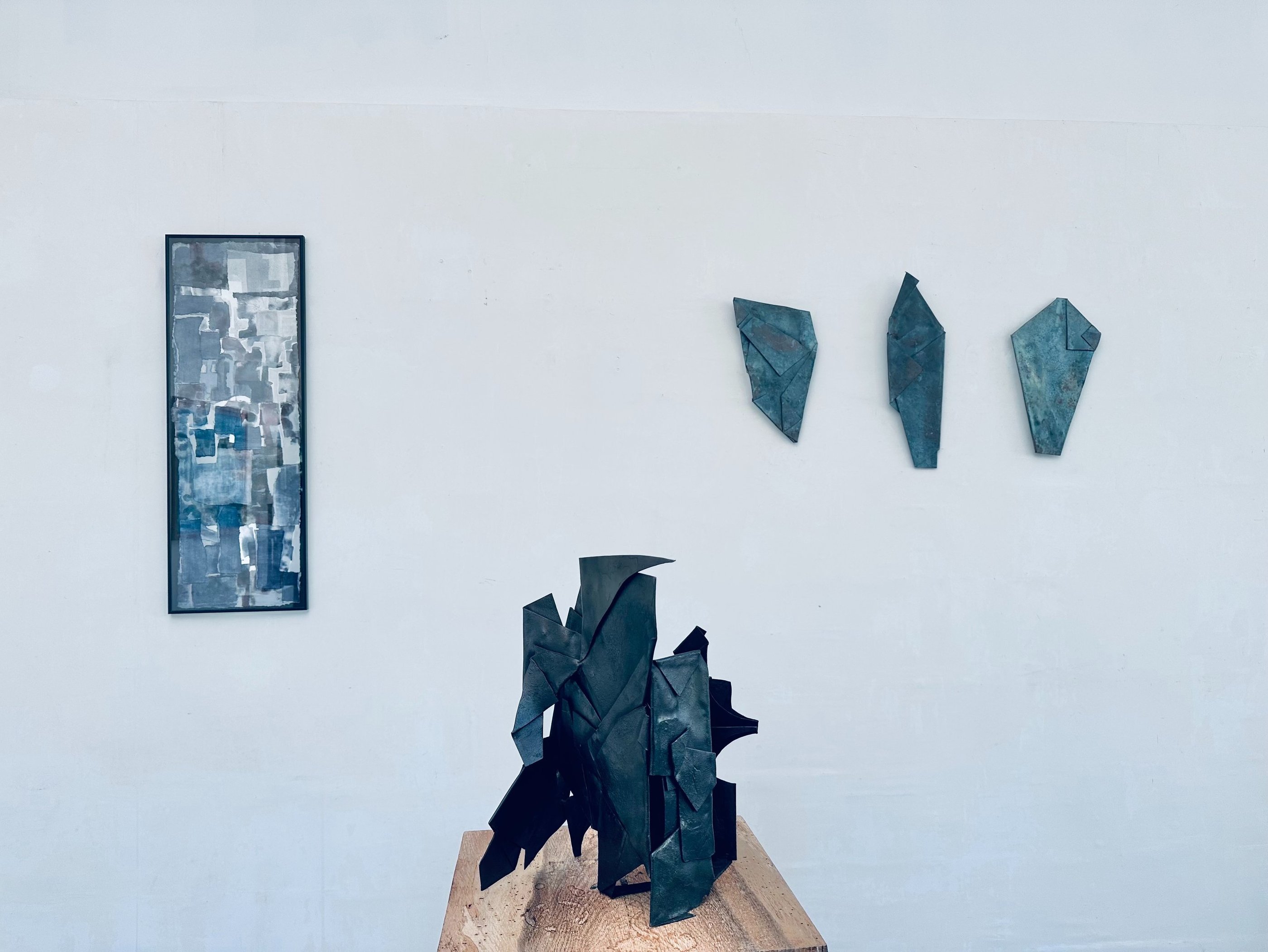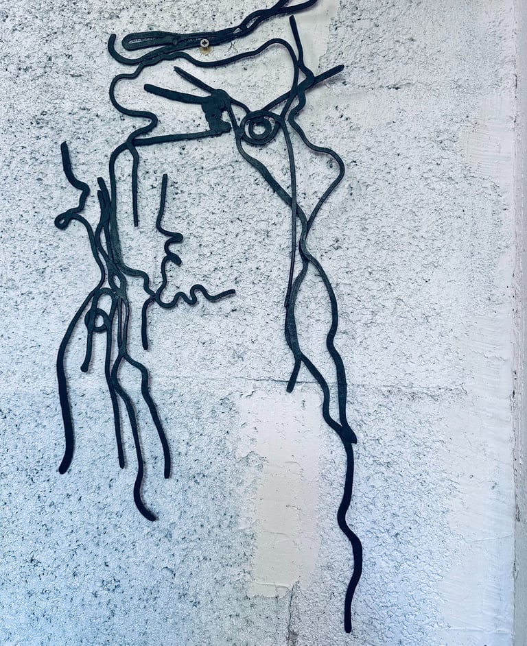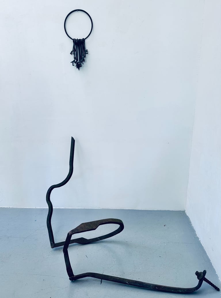 Alongside her work in the forge, she also creates large-format monotypes and explores the potentials of rubber in a production factory. Inspired by her work with this material, âLigamenâ â a reflection on connection â is a series of sculptures that she has exhibited at several art fairs. In 2011, she exhibited the piece 'Barcode', made of wrought iron and wood, alongside two large-format drawings at the 3rd Sculpture Biennale 'Inventing Singular Worlds' in Yerres, France. In 2012, she started working on larger-scale wrought iron pieces in collaboration with one of France's last remaining industrial forges.